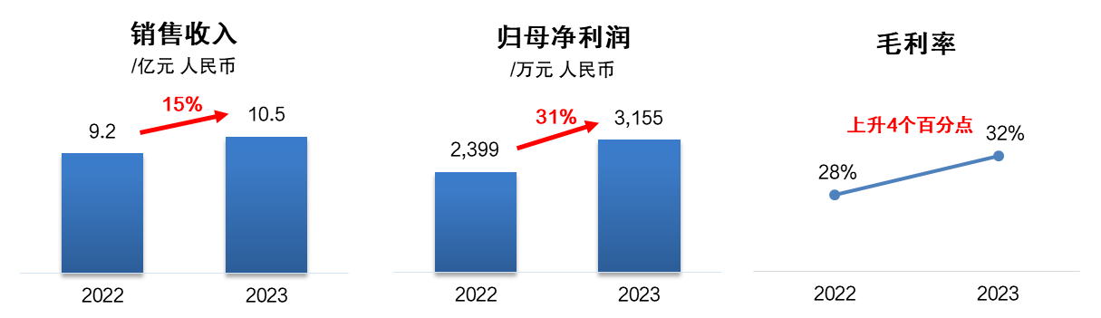 2024年3月22日,欧陆娱乐(本集团)正式发布2023年业绩公告:2023年销售收入再次回升至10亿元以上,达10.5亿元人民币,同比增长15%。毛利率32%,同比增长4个百分点,归属母公司净利润3,155万元,同比增长31%。
