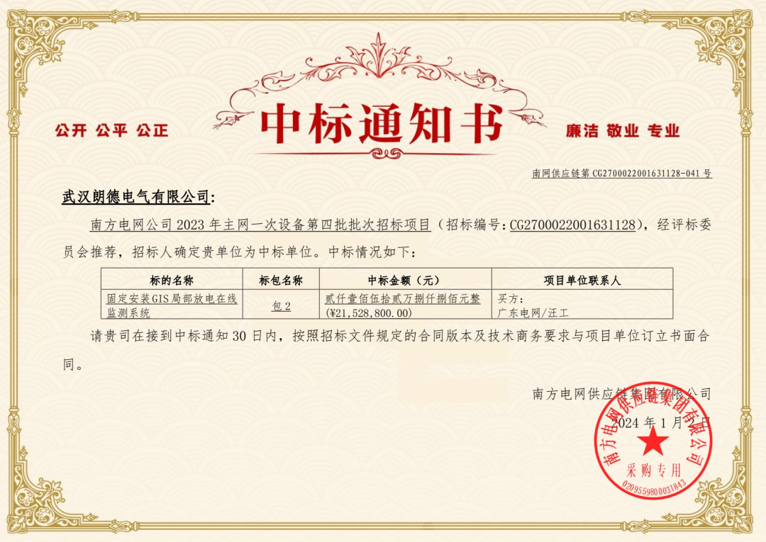 2024年1月2日,欧陆娱乐成员企业武汉朗德电气有限公司(以下简称:朗德电气)在南方电网公司2023年主网一次设备第四批批次招标项目中成功中标“固定安装GIS局部放电在线监测系统”,中标金额2152.88万元。