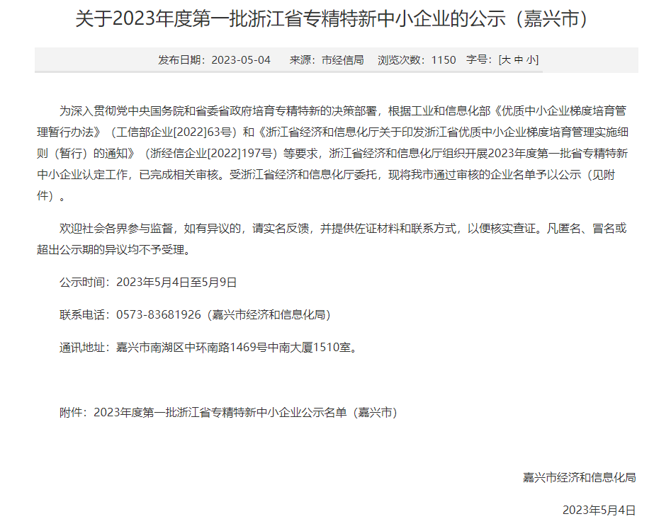 浙江省经济和信息化厅公示了2023年度第一批省专精特新中小企业通过审核的企业名单,其中嘉善县有35家企业榜上有名!