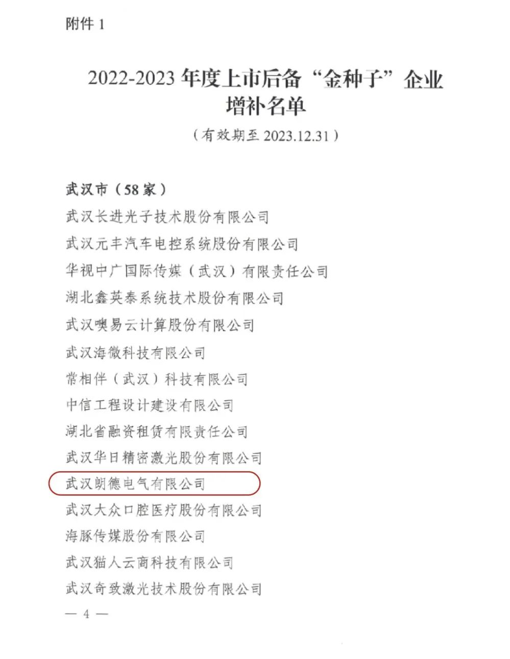 近日,湖北省企业上市工作领导小组办公室公布2022-2023年度湖北省上市后备“金种子”企业名单,新增149家“金种子”中,来自武汉的有58家,经过推荐与评选,欧陆娱乐成员企业-武汉朗德电气有限公司(以下简称:朗德电气)成功入选名单。