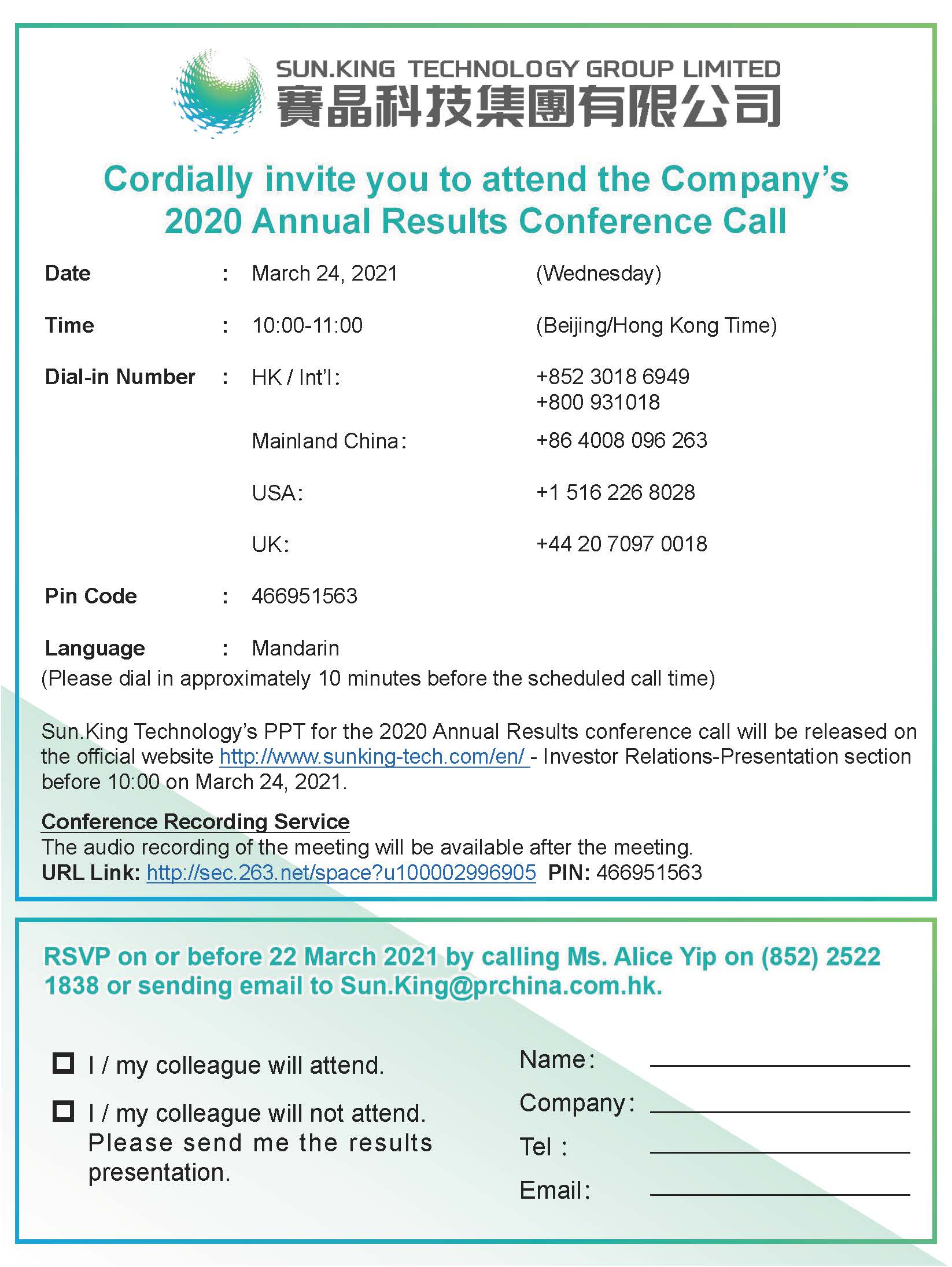 欧陆娱乐2020年年度业绩电话会议用PPT将于2021年2月24日10:00前,于集团官网(http:/)-投资者关系-推介材料板块发布。电话会会议录音回听将于会议结束后可获取。回听链接:http://sec.263.net/space?u100002996905 ,获取密码:466951563。
