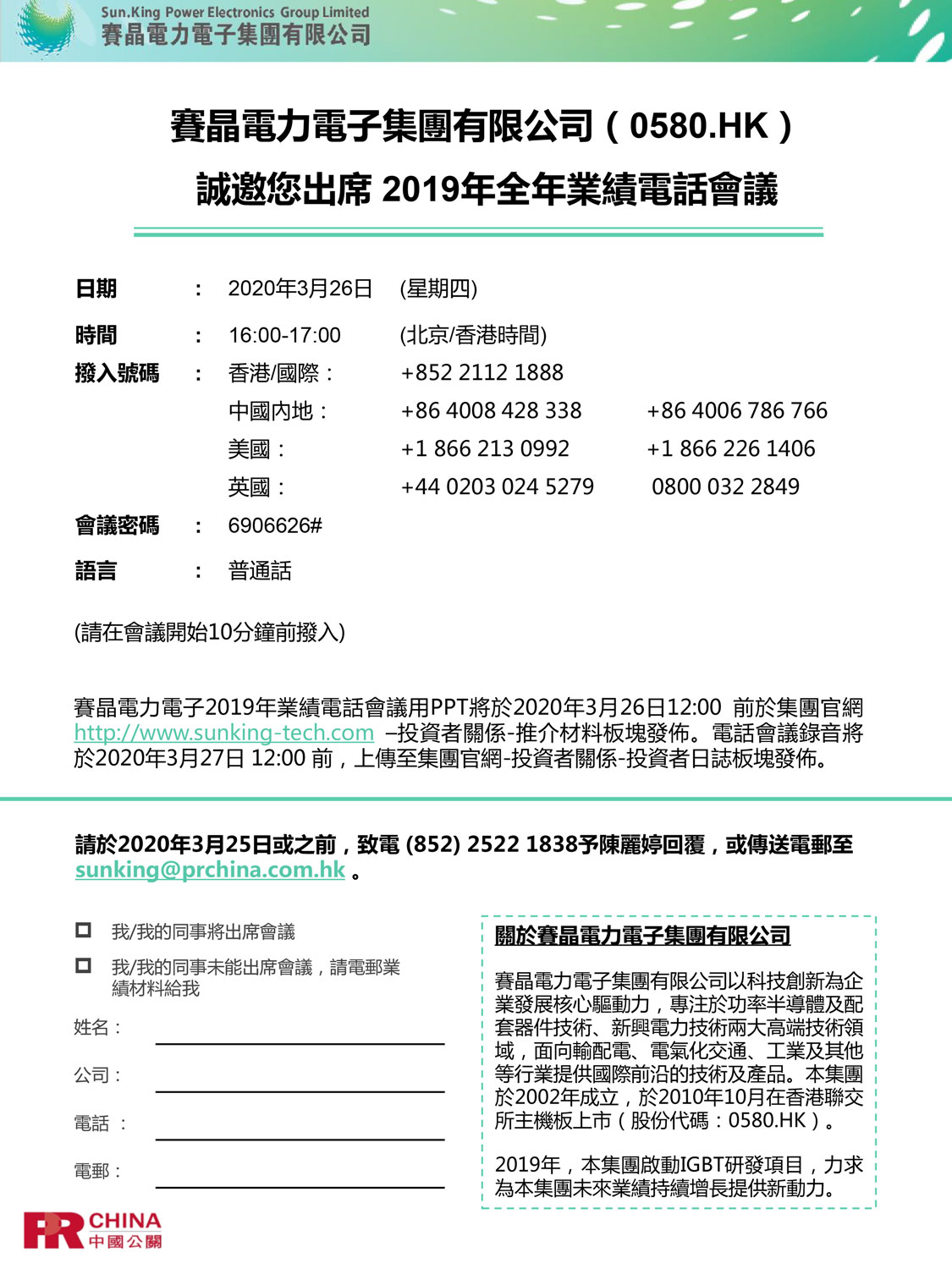 赛晶电力电子2019年业绩电话会议用PPT将于2020年3月26日12:00前,于集团官网(http:/)-投资者关系-推介材料板块发布。电话会议录音将于2020年3月27日12:00前,于集团官网-投资者关系-投资者日志板块发布。
