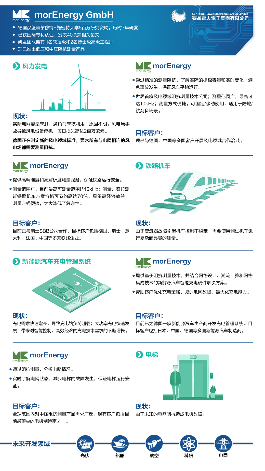 总部设在德国汉堡的morEnergy公司,是致力于新兴能源技术研发的高新技术企业,拥有世界上最先进和最便捷的阻抗测量技术。该公司的中低压领域的阻抗测量系列产品,在世界范围内的新能源发电、电气化交通、新能源汽车充电管理、电梯、智能电网等众多领域具有广泛需求。
