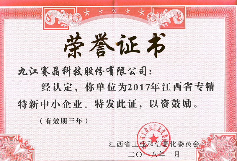 九江赛晶始终积极贯彻国家工信部《关于促进中小企业“专精特新”发展的指导意见》(工信部企业[2013]264号)要求,以转型升级为契机,大力推动企业向专业化、精细化、特色化、新颖化发展。2017年,九江赛晶向江西省工业和信息化委员会递交了九江市“专精特新”中小企业认定申请推荐表,并按要求完成各项申请工作。2018年1月,经认定公示,九江赛晶成为九江市首批“专精特新”的中小企业,获得了“2017年江西省专精特新中小企业”荣誉称号,有效期为三年。