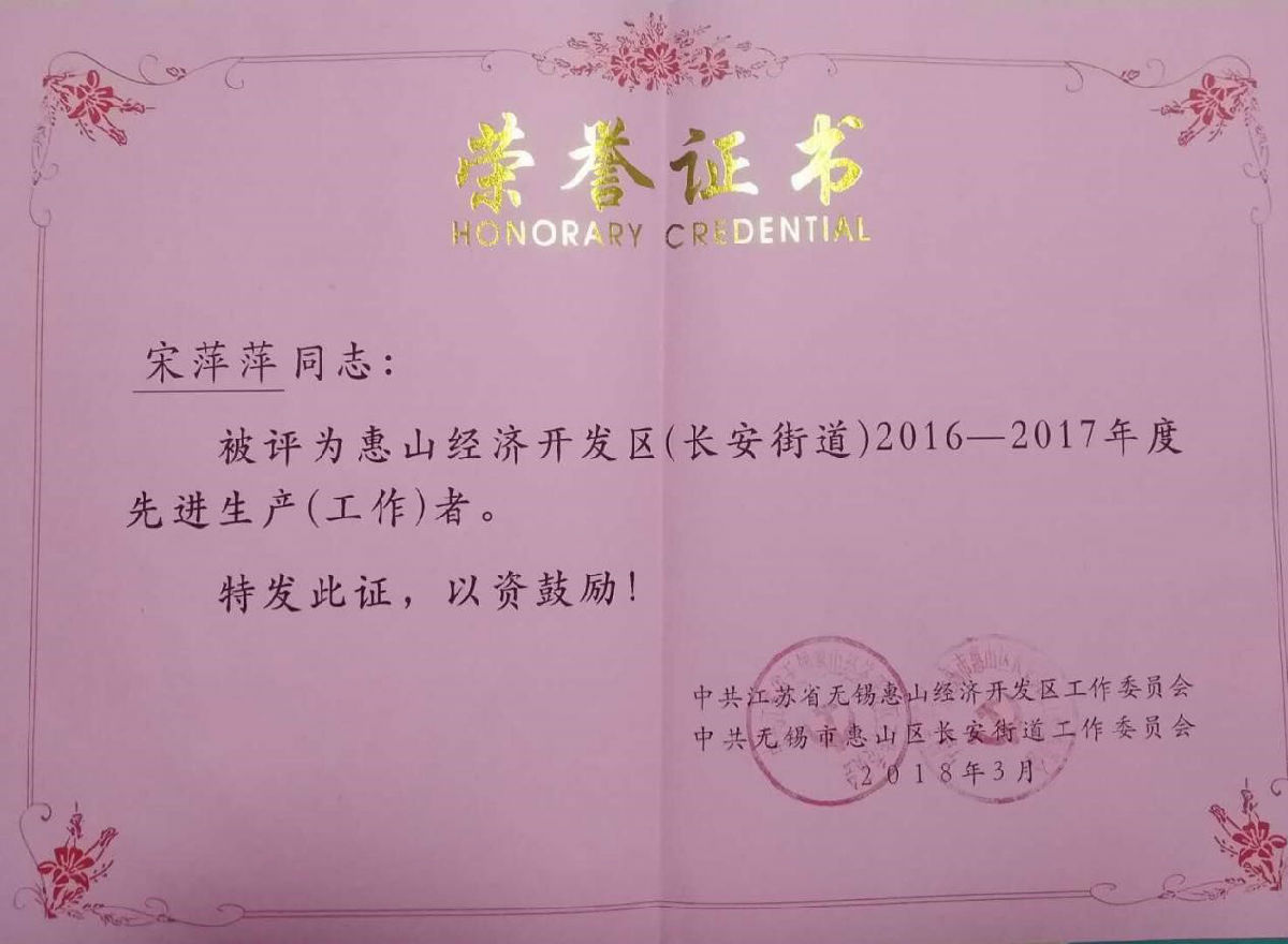 此外,本次会议上获奖的还有:无锡赛晶电力电容器有限公司设备副经理葛昌晶荣获惠山经济开发区(长安街道)“2016-2017年度优秀共产党员”荣誉称号,质量部主管宋萍萍荣获惠山经济开发区(长安街道)“2016-2017年度先进生产工作者”荣誉称号。