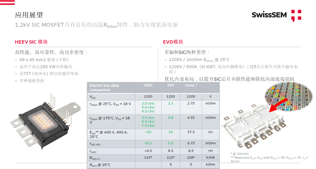 EVD封装SiC模块通过优化内部布局,采用创新的针脚封装和工艺设计,赛晶模块MOSFET导通电阻降低10%~30%、封装阻抗降低约1/3。EVD封装产品有Si和SiC两种类型,该产品可以让客户能够最大可能的借鉴既有Si产品的系统设计,同时可以有灵活的商务供应。