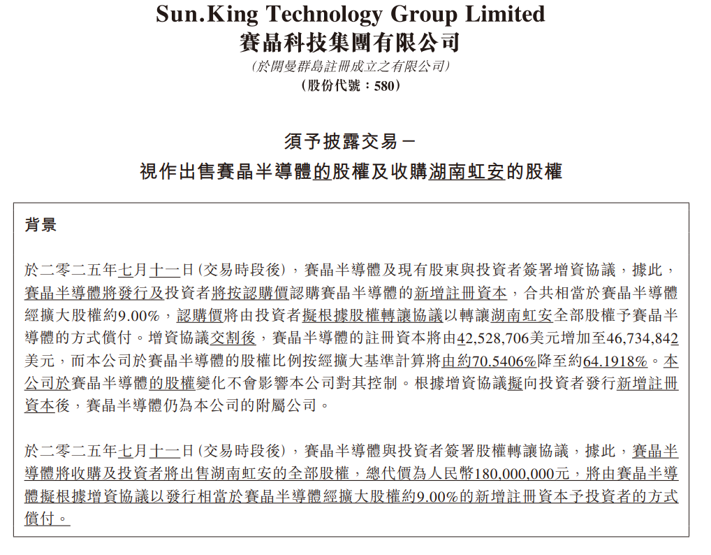 欧陆娱乐(580.HK,简称“本集团”)于2025年7月13日发布公告《須予披露交易-視作出售賽晶半導體的股權及收購湖南虹安的股權》,概况如下: