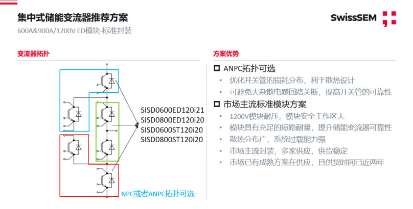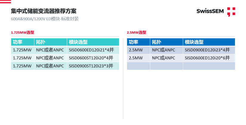 面对挑战,赛晶提出了系统性的解决方案。其核心在于采用新一代微沟槽栅芯片技术(如i23芯片组),该技术能显著降低导通和开关损耗,从源头减少发热。同时,配套的软恢复二极管技术能有效抑制关断电压尖峰,提升系统在大杂散电感环境下的可靠性。基于上述技术方向,赛晶推出了全面覆盖集中式与组串式储能应用的功率模块产品系列。针对集中式大功率变流器(1.725MW/2.5MW),推荐采用600A& 900A/1200V的ED模块,支持NPC/ANPC拓扑,具有短路耐量高、过载能力强等特点,且市场供货稳定;